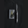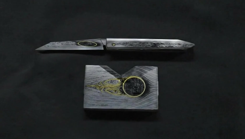The wallet and folding knife are created using powdered meteorite Damascus steel fused with high-carbon alloys, ensuring both function and permanence. At the center of each set is a meteorite puck, symbolizing a gravitational singularity:
